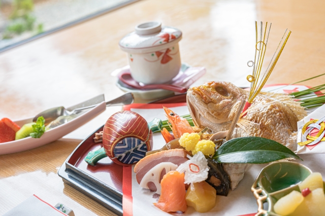 The menu is based on the basic Japanese cooking principle of “one soup, three greens,” consisting of rice, soup, three side dishes, and pickles. The three side dishes are namasu, nimono, and yakimono.