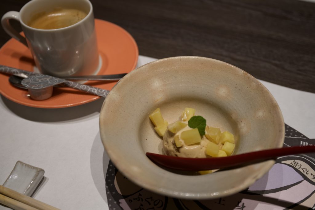Ice cream with sweet potato. You can also have coffee or tea.