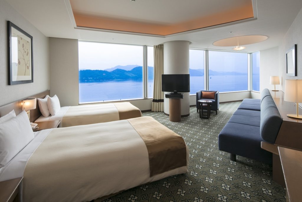 Grand Prince Hotel Hiroshima is located in a perfect location facing the Seto Inland Sea National Park, and seems to be surrounded by the sea and sky. The panoramic view of the Seto Inland Sea can be enjoyed from the restaurant on the upper floors. Both daytime and nighttime views are spectacular, with the sea and starry sky at night and the sunrise in the morning. The World Heritage Site “Aki no Miyajima” can be reached in about 26 minutes by high-speed boat from the pier in front of the hotel. It is a very convenient location as a base for your sightseeing in the Seto Inland Sea.