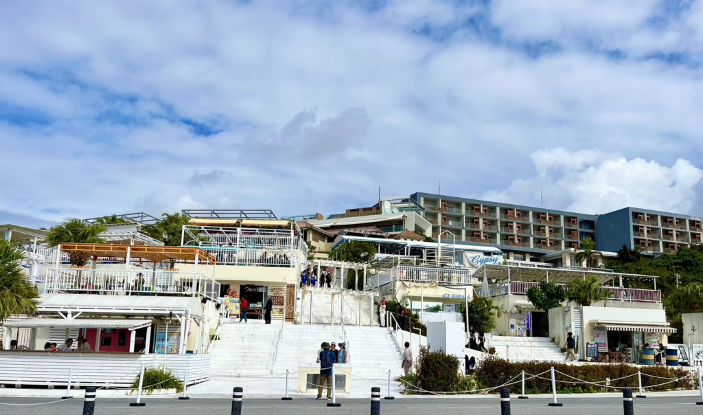 The exterior of Umikaji Terrace looks like a European resort. A staircase of chalk buildings overlooking the sea.