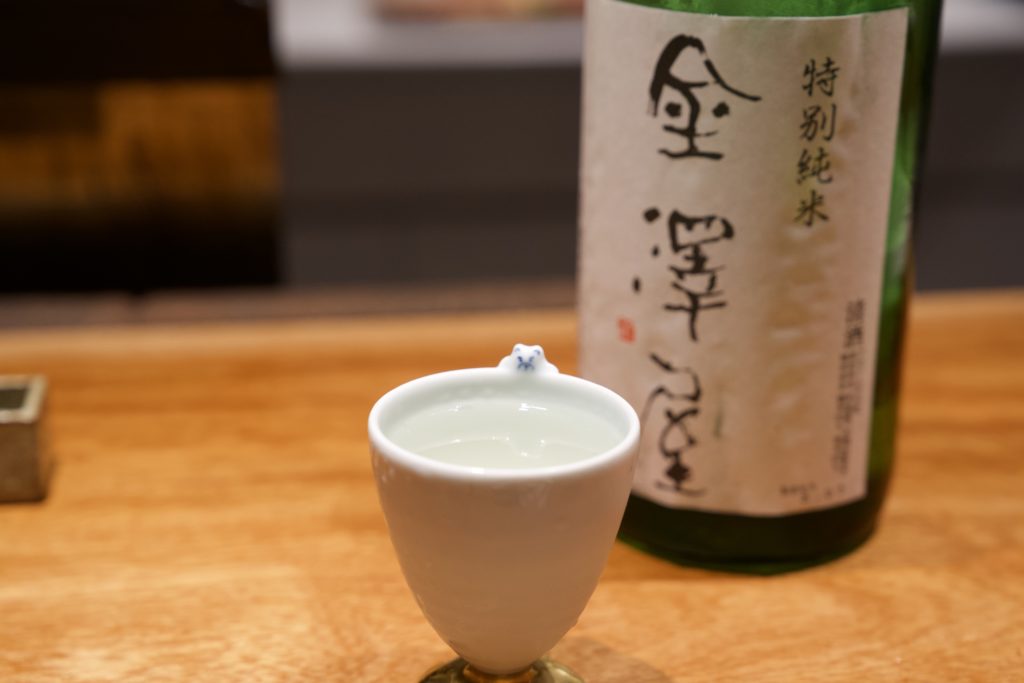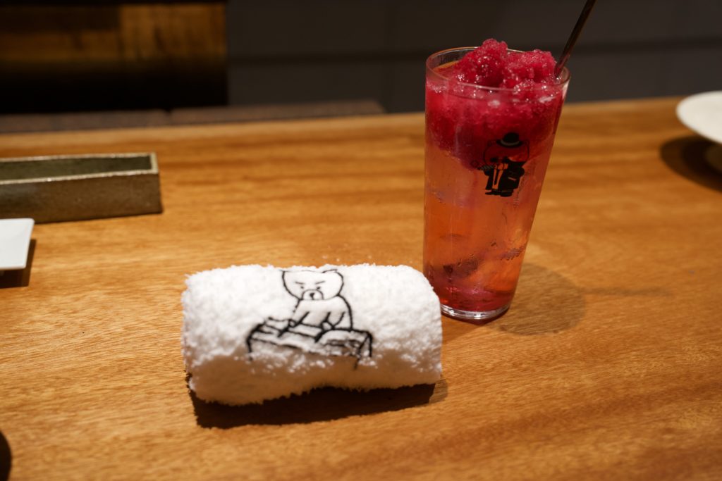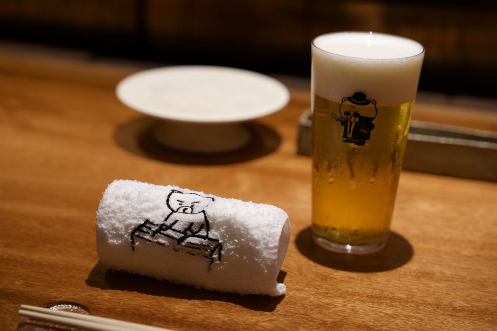 A bear is peeking out of the sake cup. Your playfulness is cute, isn’t it? The combination of sake and yakitori is also the best.