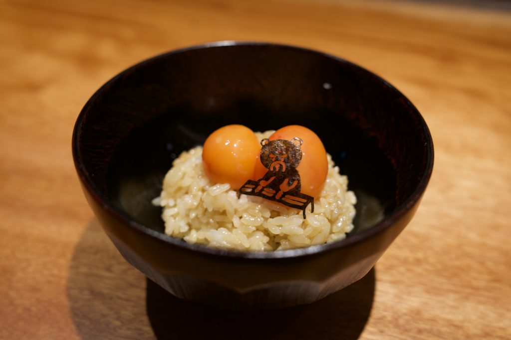 The famous “Kuma no Tamagokake Gohan” is made with the ovaries before they become eggs and the bear’s yakitori special soy sauce.